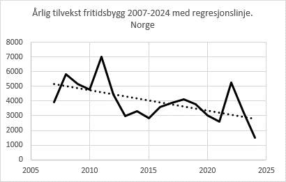Perioden 2007 til 2012 var preget av høy årlig tilvekst, men deretter er den årlige tilveksten vesentlig redusert, bortsett fra i 2022 da fritidsboligbyggingen var «all time high». På landbasis viser trendlinjen en halvering av tilveksten fra 2007 til 2025. Samlet for fjellområdene er nedgangen mindre enn for landet, og det skyldes utbygging i tilknytting til alpindestinasjoner.
