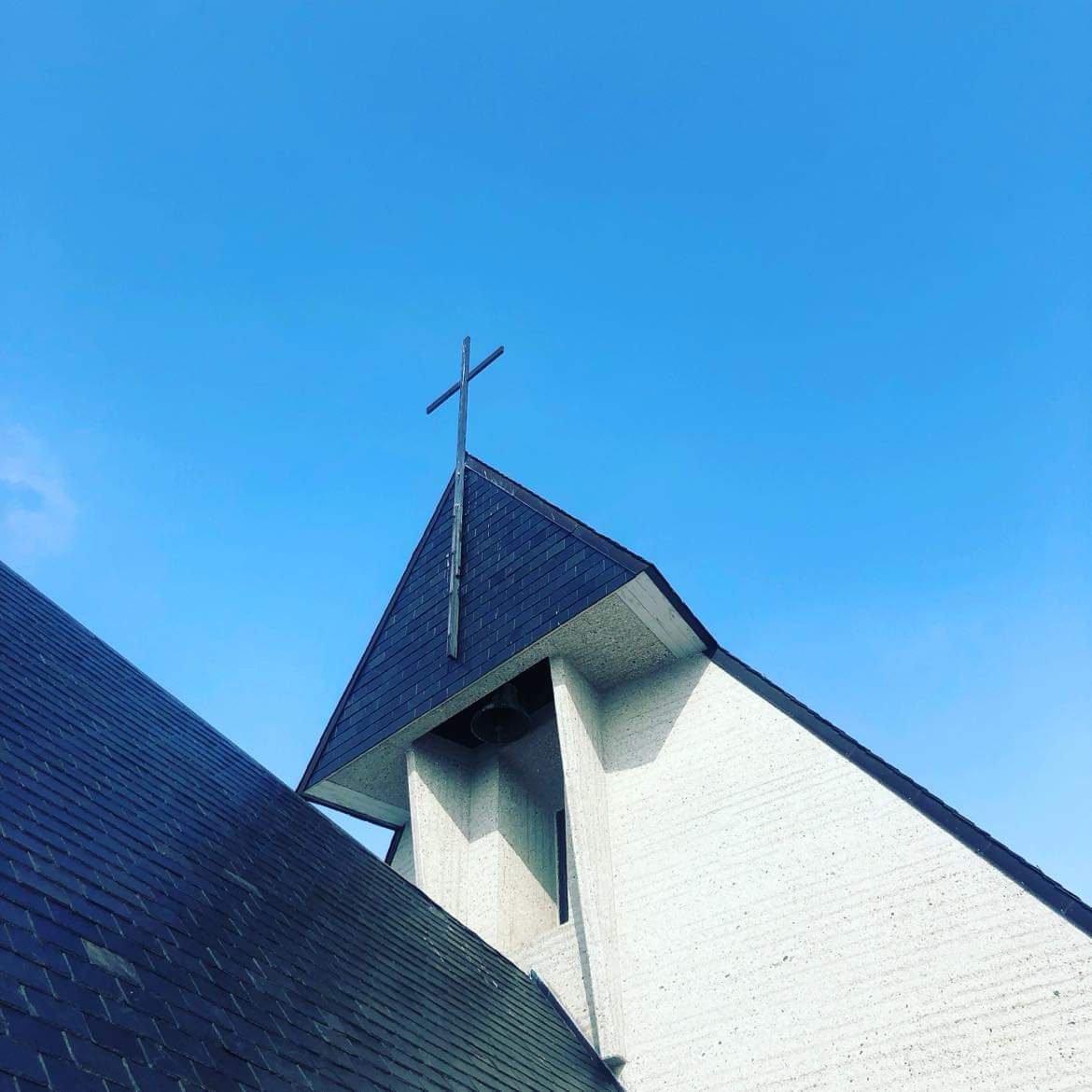 Hvit kirketårn mot blå himmel