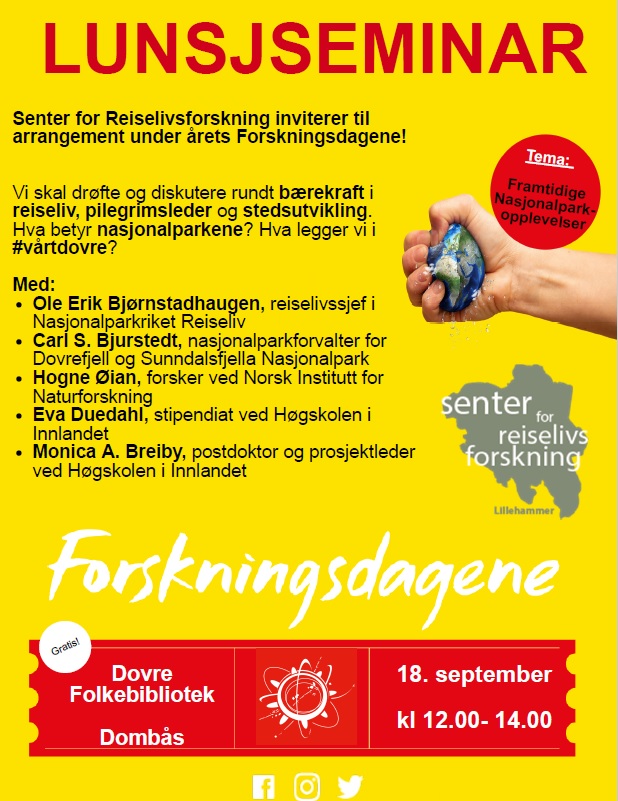 Etter det er det tid for et åpent Lunsjseminar det bærekraft, pilgrimsleder, stedsutvikling og nasjonalparkene står sentrale. I tillegg til prosjektets reiselivsforskere blir det innlegg fra Ole Erik Bjørnstadhauegn fra Nasjonalparkriket Reiseliv og Carl S. Bjurstedt, nasjonalparkforvalter for Dovrefjell og Sundafjell Nasjonalpark.